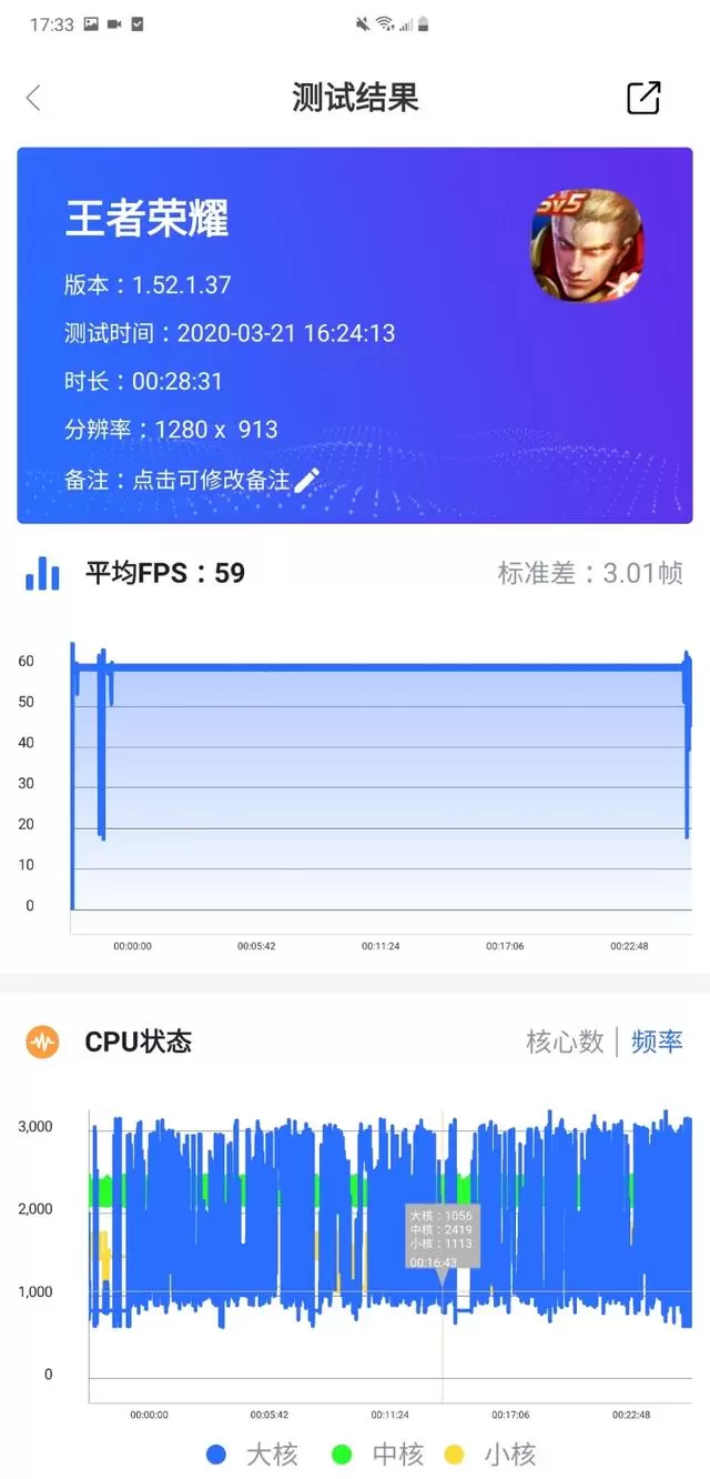 我们以《王者荣耀》为例,在各项设置均为最高的情况下,游戏可以满帧率运行,在后期团战需要大招齐放的情况之下,手机的帧率依旧稳定流畅。其他普通的游戏对于心系天下三星W20 5G来说没有任何压力的。而且一局游戏下来手机握感仅仅是温热状态,并不会烫手。