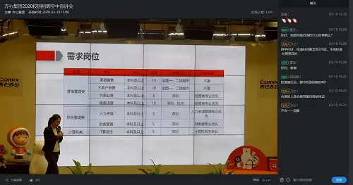 齐心集团校园招聘从3月开始进入网申阶段,目前已经成功举办了4场招聘空中宣讲会,宣讲老师与同学们在线交流。校园招聘岗位涵盖营销管理类、综合管理类、计算机类,具体岗位包括渠道销售、大客户销售、外贸业务、电商运营、人资资源、财审、软件开发等。
