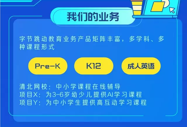 公开资料显示,目前字节跳动教育业务横跨pre-k,k12,成人教育多年龄段,产品矩阵丰富,涵盖多学科、多种课程形式。基于字节跳动集团丰富的流量、算法、数据、内容等积累,其在线教育业务将尝试与技术紧密结合,不断拓展产品边界,做面向未来的教育产品。