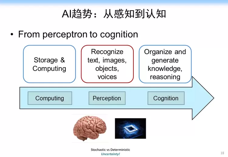 我们再深入分析 AI 近十年的发展,会看到一个重要的标志:人工智能在感知方面取得重要成果。人工智能在语音识别、文本识别、视频识别等方面已经超越了人类,我们可以说 AI 在感知方面已经逐渐接近人类的水平。从未来的趋势来看,人工智能将会有一个从感知到认知逐步发展的基本趋势,如下图所示: