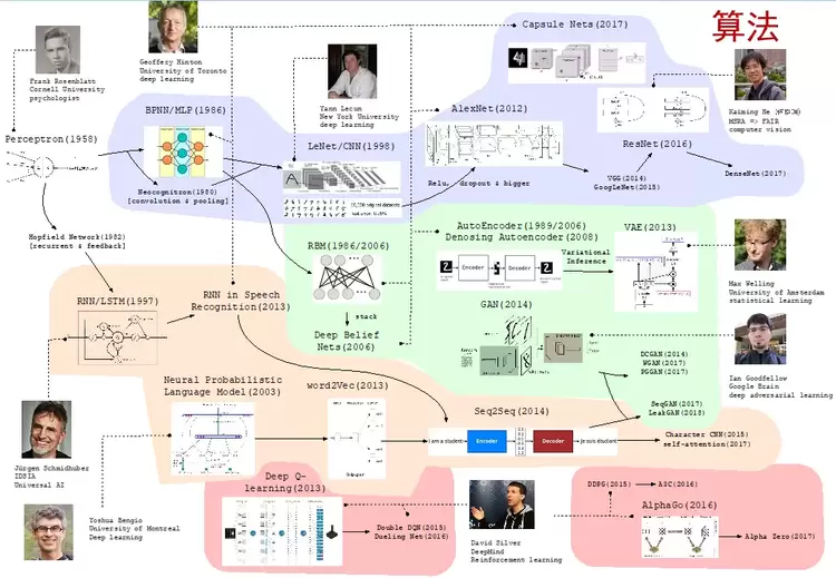 总体来讲,我们可以把深度学习算法归类为这四个脉络,而这四个方面都取得了快速的进展。