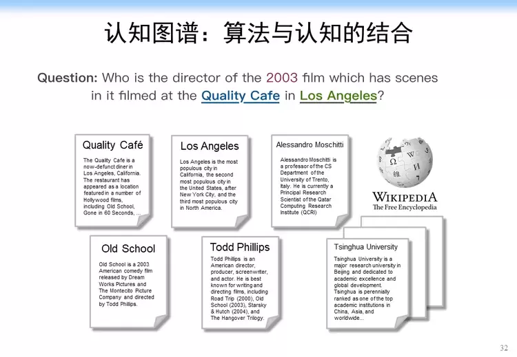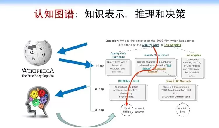 相信很多人对认知图谱都比较陌生,这里我们举一个例子来说明一下。假如我们要解决一个问题“找到一个 2003 年在洛杉矶的 Quality 咖啡馆拍过电影的导演(Who is the director of the 2003 film which has scenes in it filmed at The Quality Cafe in Los Angeles)”。如果是人来解决这个问题的话,可能是先追溯相关的文档,如 Quality 咖啡馆的介绍文档,洛杉矶的维基百科页面等,我们可能会从中找到相关的电影,如 Old School ,在这个电影的介绍文档里面,我们可能会进一步找到该电影的导演 Todd Phillips,经过比对电影的拍摄时间是 2003 年,最终确定答案是 Todd Phillips,具体流程如下图所示: