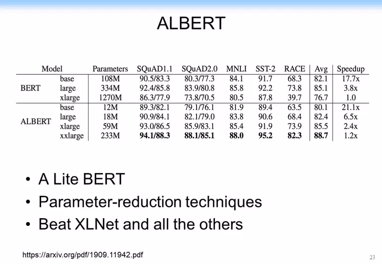 再后来,ALBERT 又超过了 XLNet 和原始的 BERT(想深入了解的读者可以阅读https://arxiv.org/pdf/1909.11942.pdf)。整个 BERT 的发展引发了后续一系列的工作。