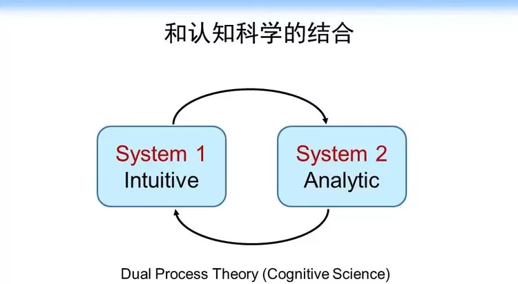 这个基本的思想是结合认知科学中的双通道理论。在人脑的认知系统中存在两个系统:System 1 和 System 2,如下图所示。System 1 是一个直觉系统,它可以通过人对相关信息的一个直觉匹配寻找答案,它是非常快速、简单的;而 System 2 是一个分析系统,它通过一定的推理、逻辑找到答案。
