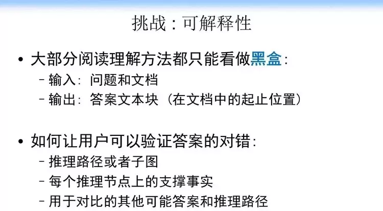 当我们用传统算法(如 BIDAF, BERT, XLNet)进行解决的时候,计算机可能只会找到局部的片段,仍然缺乏一个在知识层面上的推理能力,这是计算机很欠缺的。人在这方面具有优势,而计算机缺乏类似的能力。