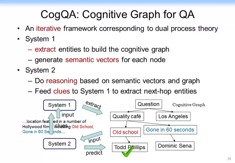 可以看到,我们在 System 1 中做知识的扩展,比如说针对前面的问题,我们首先找到相关的影片,然后用 System 2 来做决策。如果是标准答案,就结束整个推理的过程。如果不是标准答案,而相应的信息又有用,我们就把它作为一个有用信息提供给 System 1,System 1 继续做知识的扩展,System 2 再来做决策,直到最终找到答案。