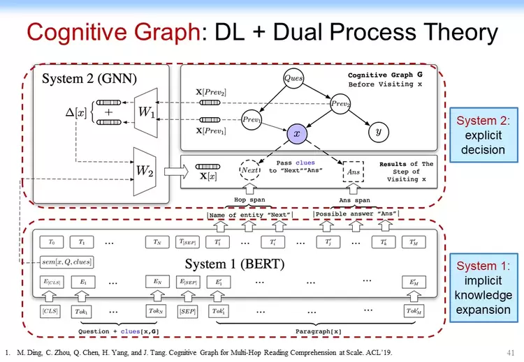 现在,在这两个系统中,System 1 是一个直觉系统,我们用 BERT 来实现,实现了以后,我们就可以做相关的信息的匹配;System 2 就用一个图卷积网络来实现,在图卷积网络中可以做一定的推理和决策。通过这个思路,我们就可以实现一定的推理+决策。