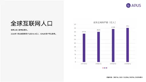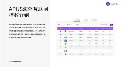 为了让中国企业对全球互联网行业、尤其是主要国家互联网应用流行趋势有更直观的判断,APUS研究院自2018年始推出了移动互联网应用一站式查询平台 -- APUS海外互联网指数。依托 APUS全球14亿的海量用户资源以及大数据BI技术,APUS海外互联网指数可以以月度为单位、实现对全球20个国家和地区、近2000款安卓APP数据活性的即时监测,客观反映某款移动应用的活性和受欢迎程度。
