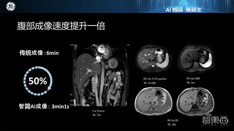 以磁共振最重要的成像部位之一——腹部常规成像为例,传统成像需6分钟,而基于智简AI技术的磁共振设备,仅3分钟便完成了检查。