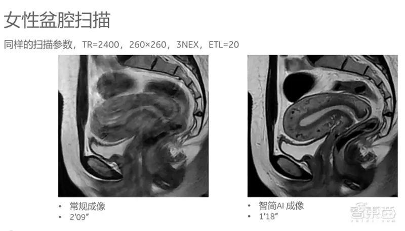 如下图所示,左图常规成像运动伪影严重,右图使用智简AI消除运动伪影,不仅可以优化子宫影像的对比度,而且将成像时间从原来的2分09秒缩短至1分19秒。