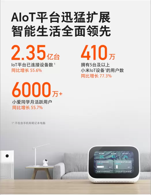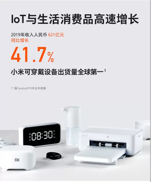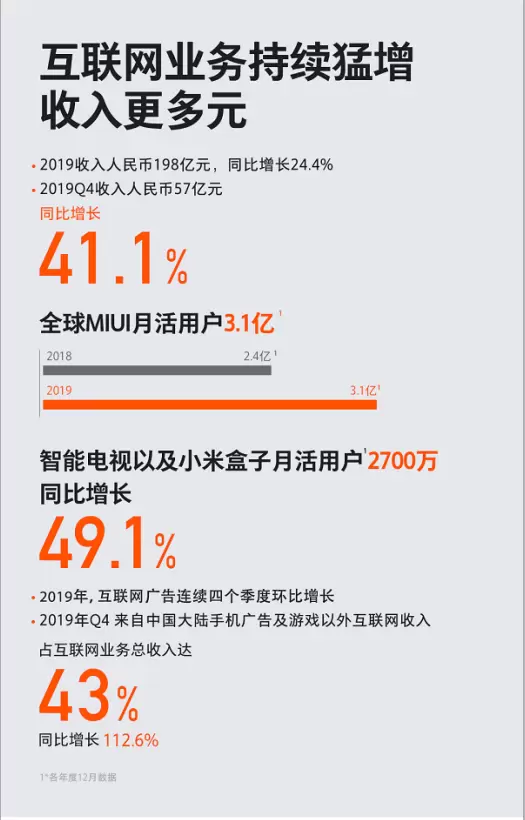 从各主营业务的表现来看:2019年,小米智能手机正式启动双品牌策略,全年出货量1.25亿台;AIoT业务持续领先,智能电视国内年出货量超1000万台,创造了中国电视史上的奇迹;截至2019年12月31日,小米IoT平台已连接的IoT设备数(不包括手机和笔记本电脑)达到2.35亿 ,同比增长55.6%;智能语音助理“小爱同学”的月活用户数在2019年12月超过6000万,同比增长55.7%;互联网收入人民币198亿,同比增长24.4%。