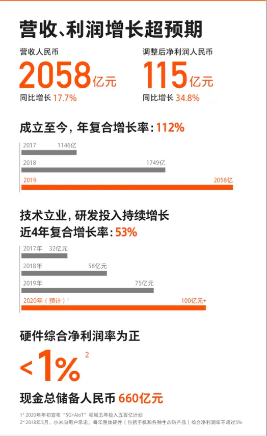小米集团今天发布的2019年全年业绩显示:2019全年小米总收入突破2000亿,达到2058亿元人民币,同比增长17.7%;经调整后净利润人民币115亿,同比增长34.8%。