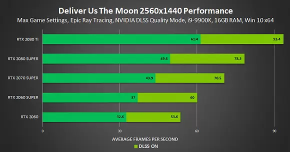 在游戏《飞向月球 (Deliver Us The Moon)》中,DLSS在多款GPU和不同分辨率下可将帧率提升至 1.6 倍以上: