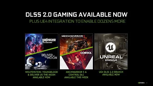 目前我们已经能在《机械战士5:雇佣兵》、《控制》、《飞上月球》和《德军总部:新血脉》四款游戏中体验到DLSS 2.0,虚幻4游戏引擎也已经支持DLSS2.0。英伟达还表示,由于DLSS 2.0不再需要每个游戏场景独立训练,未来加快将此技术引入到各种游戏中。