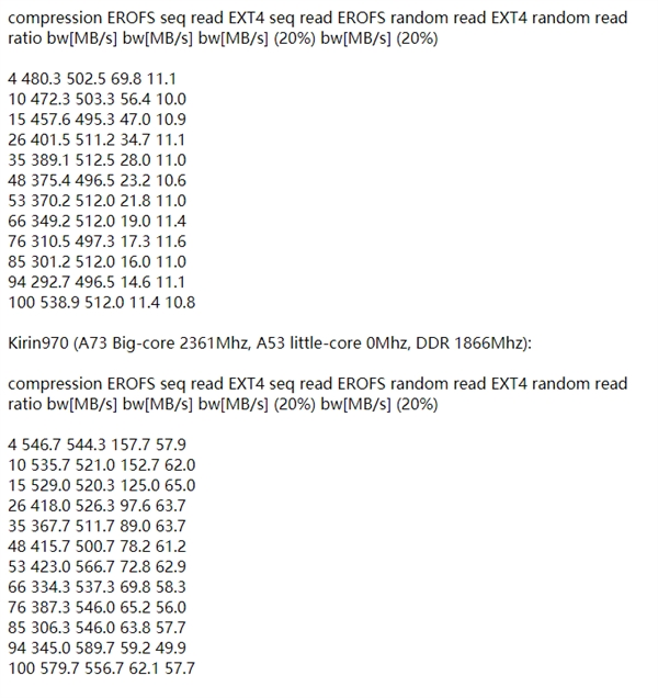 工程师对比了一套Linux服务器和麒麟970平台在使用EROFS和EXT4(ext4)两套文件系统执行压缩操作时的连续/随机读取数据,服务器平台的连续读取并不是很优秀,但是随机数据一直对ext4有非常明显的优势,最高超过了500%。