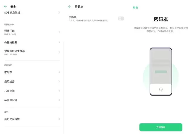 日常生活中各式各样的应用都需要有账户才能登陆,导致了我们需要频繁地输入密码,很容易让第三方恶意软件盗取。因此,在ColorOS 7版本中加入了密码本工具,密码本能够帮我们机主各种复杂密码,当我们使用某个应用或网站时,能够为我们自动进行填写,轻松登陆,告别输入风险。