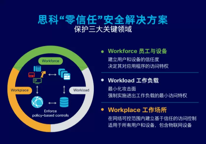 思科主张因地制宜而非一刀切式地进行安全性管控,通过以上步骤制定思科零信任框架,保护企业三大关键领域,且系统性地解决安全问题: