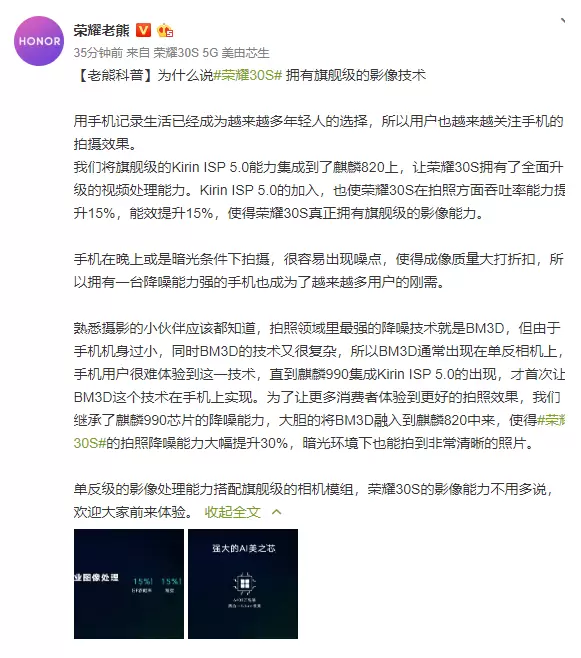 3月30日晚间,青年潮旗舰荣耀30S正式发布。首发搭载最新一代5G“神U”麒麟820,实力超群、性能卓越、颜值能打,同时价格亲民,荣耀30S被称为“5G神机”,正全方位加速5G手机普及。与此同时,伴随着荣耀30S的到来,5G手机影像竞赛也已进入以芯片为基础,围绕全场景应用而展开的全新阶段。