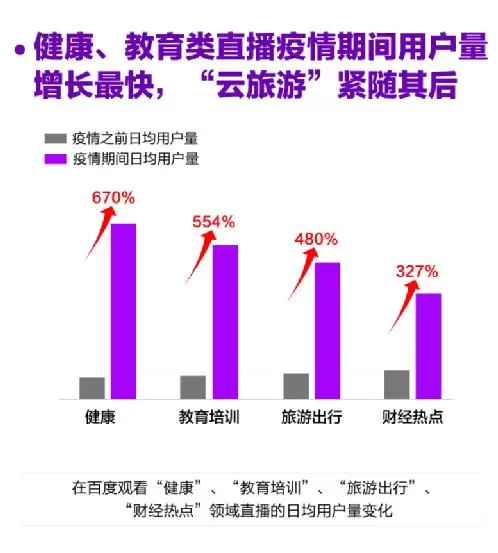 与此同时,用户对于直播的需求也并不局限于娱乐领域,其中,信息类和知识类的直播在百度平台尤其受欢迎。数据显示,疫情爆发后,百度平台中健康、教育培训、旅游出行、财经热点等信息和知识领域的直播日均用户量增长最快,分别较疫情之前增长了670%、554%、480%和327%。