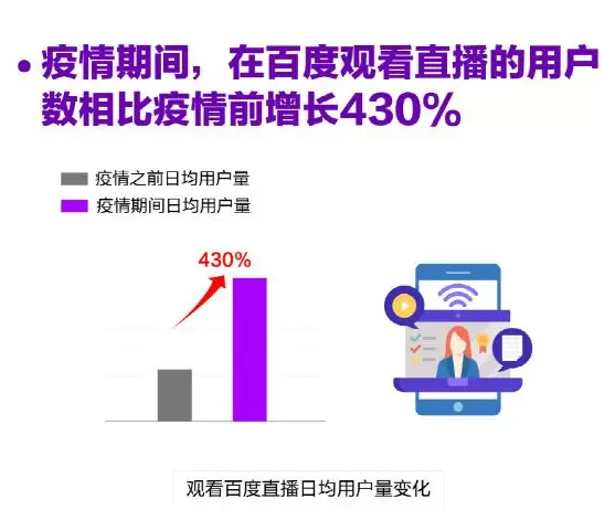 疫情时期,用户获取和疫情相关的知识信息的需求激增,平均每天有超过10亿人次通过百度搜索了解疫情信息,直播自然也成为重要的内容呈现方式。报告数据显示,疫情期间在百度观看直播的用户数相比疫情前增长了430%。