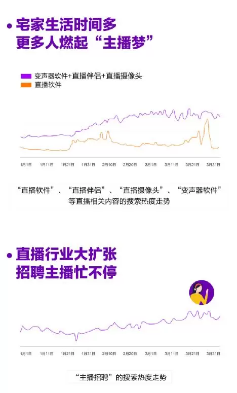 另一方面,由于宅家的关系,有更多人在疫情期间燃起“主播梦”。数据显示,主播必备的“直播软件”、“直播伴侣”、“直播摄像头”、“变声器软件”等相关内容的搜索热度在疫情期间一路走高,“主播招聘”的搜索热度也在相应攀升。