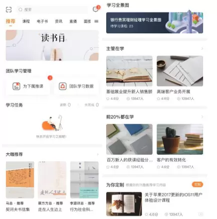 据悉,知鸟智能培训一体化平台的内容聚合系统已与哈佛商学院、混沌大学、樊登读书会、中欧等100多家权威机构合作,汇聚了国内最权威、高端、精品的在线教育资源。平台依托知鸟个性化推荐引擎,面向22个行业近300类工种/岗位提供相关职业技能课程3万门、各类专业认证考试题库10万+,能够避免学员在海量资源中“迷航”,快速获取优质资源,提升在线学习体验。