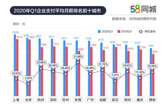 从城市薪资方面来看,58同城招聘研究院数据显示,2020年一季度,招聘活跃城市薪资整体呈现上涨趋势。其中,上海企业平均支付月薪仍然稳居第一,达到10526元,其次是北京、杭州和深圳,企业平均支付月薪分别为9788元、9657元和9571元。而在薪资增幅方面,2020年一季度,东莞以31.68%的同比增幅位居企业薪资增长榜首位,杭州则实现了23.68%的同比增幅。这表明,上海、北京等经济发达的一线城市收入水平高,而新一线城市受新兴产业、朝阳产业集聚的影响,跑出了收入增长的“加速度”。