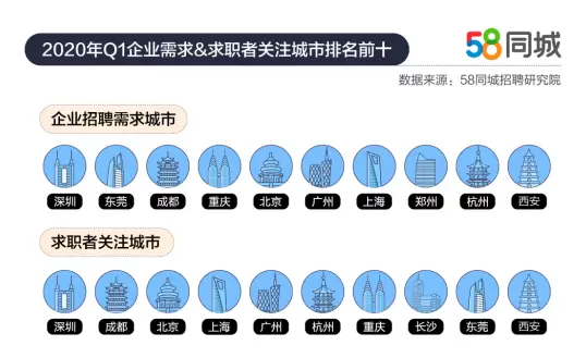 58同城招聘研究院《2020年一季度人才流动报告》表明,企业招聘需求排名前五的城市依次是深圳、东莞、成都、重庆和北京。由于深圳的物流配送和互联网产业发达,受疫情冲击相对较小,因此企业招聘需求排名第一。与去年同期相比,东莞的企业招聘需求排名上升了5个位次,早在2月5日,东莞就发布了《关于做好企业节后复工用工工作的通告》,“快半拍”地指导企业做好招工,使企业招聘需求得到较快释放。