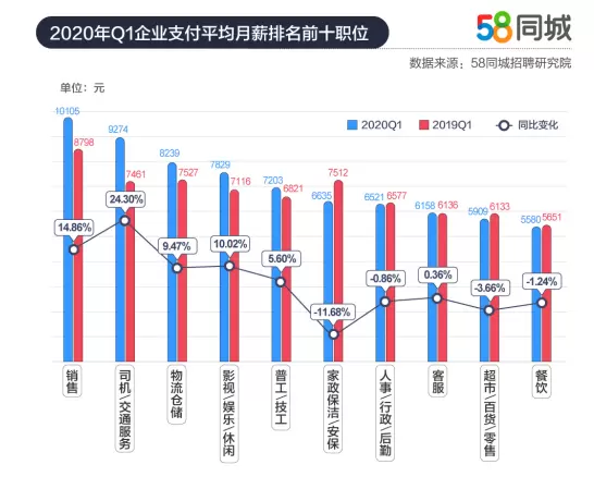 58同城2020年一季度人才流动报告 销售类职位支付及期望薪资排名首位