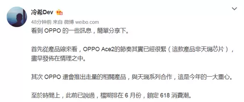 业内人士@冷希Dev在其微博发布:“OPPO Ace2的节奏其实已经很紧(这款产品非天玑芯片),尽早发布在情理之中“。此举也肯定了OPPO Ace2不会推出天玑1000芯片。考虑到Ace系列产品的定位,预计将使用骁龙平台,将主打游戏性能。