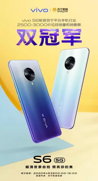 4月3日,vivo S6开启首销。截至当日16:00,新机斩获苏宁易购、京东、天猫三大电商平台2500-3000价位段新品销量及销售额双冠军。凭借其双模5G、潮流外观配色设计以及优质夜景自拍体验,vivo S6成为了当下最受年轻人欢迎的中端档位5G手机之一。