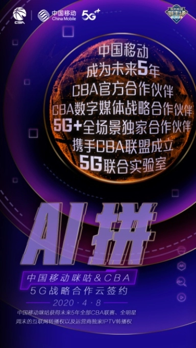 4月8日,中国移动咪咕公司与CBA联盟举行主题为“AI拼”的5G战略合作“云”签约仪式,在上一周期良好合作基础上,双方决定围绕5G进行战略合作升级,成立5G联合实验室,助力中国职业篮球迈入5G时代,为广大球迷带来“5G+体育”的全场景沉浸式体验。通过本次合作,中国移动成为未来5年CBA官方合作伙伴,旗下咪咕公司成为未来5年CBA数字媒体战略合作伙伴、5G+全场景独家合作伙伴,获得未来5年全部CBA联赛、全明星周末的互联网转播权以及运营商独家IPTV转播权。