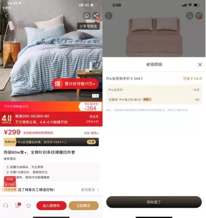 以网易严选热销60万件的商品全棉针织条纹裸睡四件套为例,按照411的满200减35,满300减60的优惠政策,原价299元的四件套预计到手价为264元,而Pro会员叠加优惠之后的到手价为244.1元,对于有消费券和红包的用户来讲,最终到手价甚至更低。