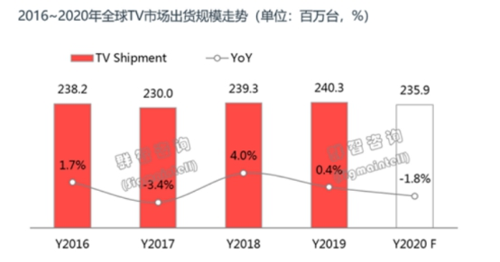 据群智咨询(Sigmaintell)数据显示,2016年-2019年全球电视市场的出货量相对比较稳定,整体在2.3-2.4亿台左右,并预计2020年全球电视市场出货量虽有所下降,但仍然有2.36台左右。这也让智能电视成为了手机品牌开拓新市场的突破口,而他们的目标不仅是大屏电视市场,还有其背后的AIoT生态市场。
