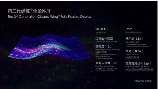 在柔宇技术大会中,柔宇科技创始人、董事长兼CEO刘自鸿就提到,针对全柔性屏全新的显示形态,柔宇自主定义了新一代智能显示驱动芯片和电路设计,与第二代蝉翼全柔性屏相比较,第三代蝉翼全柔性屏的亮度提高50%,此外,在其他光学参数,包括对比度、色域、响应速度等,都达到了业内领先的色彩显示效果。对比市面上传统OLED屏,第三代蝉翼全柔性屏在30°视角下色偏JNCD (Just Noticeable Color Difference)降低至0.6,亮度衰减优越1.5倍,均达到业内领先水平,无论在任何角度、形态下,都能拥有惊艳的画面表现。相较而言,在采用LTPS技术的柔性OLED面板上,我们很少能看到哪家厂商能够如此大幅度提高其柔性OLED面板显示性能。