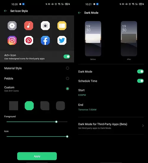 在界面设计上,ColorOS 7.1 的视觉更加轻量且具有整体性,在XDA 看来ColorOS 7.1的全新 UI 界面「Colorful but not gaudy」,同时 ColorOS 7.1 还支持自定义桌面图标形状与大小,自由度颇高,而「全天候暗色模式」能够主动支持第三方 APP,让用户获得更加沉浸的暗色体验。