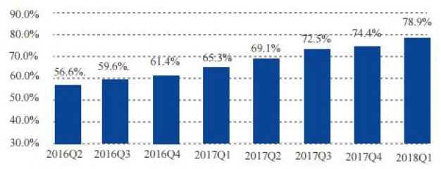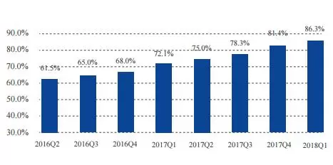 图2 2016年第二季度至2018年第一度全国移动宽带家庭普及率对比
