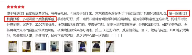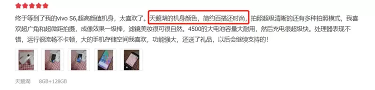 首先是颜值,用户们对vivo S6的颜值可谓是令人津津乐道,正如下面这两位用户评价的那样“第一眼睇尼手机真好看,多瑙河尼个颜色真系靓……”;“天鹅湖的机身颜色,简约百搭还时尚”。