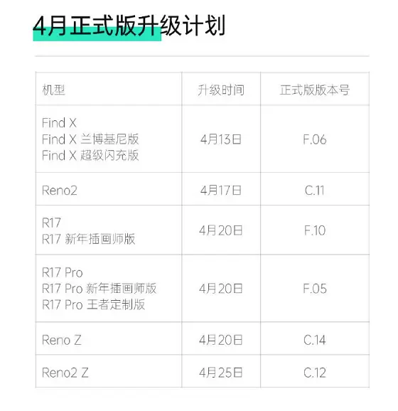 2020 年 4 月 10 日ColorOS在其官方微博宣布将有 11 款机型于本月开放ColorOS 7 正式版升级。具体机型有:FindX 系列、Reno2、R17 系列、R17 Pro 系列以及 Reno Z 和 Reno2 Z 。