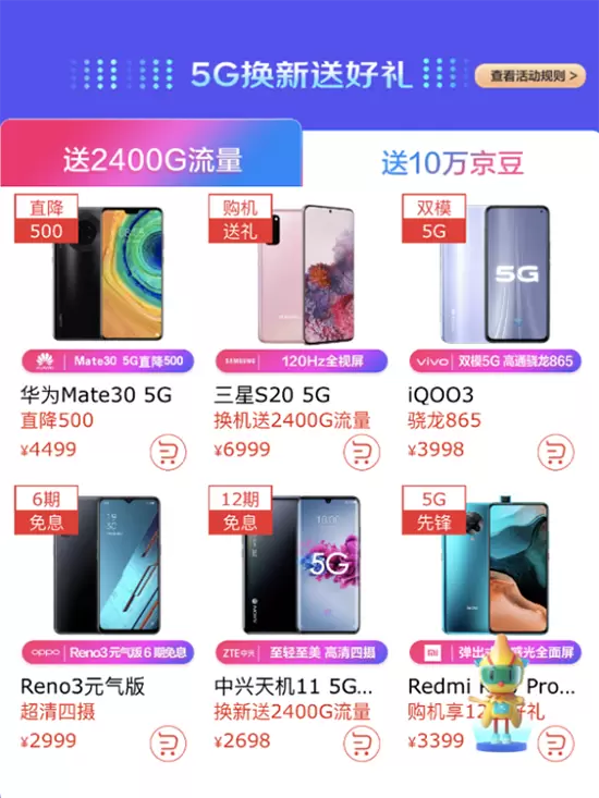 最终,李航选择了一部5G手机。他的理由很充分,首先,迟早要换5G手机,不如现在一步到位;其次,京东手机换新季有很多专门针对5G的服务,手机、配件、套餐可以一站式配齐,买5G手机还能赠送2400G流量或者10万京豆,京东物流的速度很快,只需1天,他就能拿到新手机。