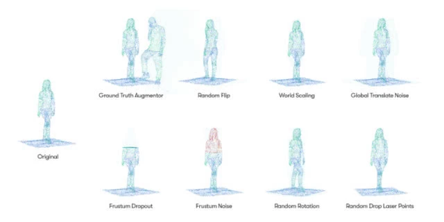 PPBA旨在提高激光雷达的检测能力。激光雷达通过激光照射和测量反射脉冲来测量车辆与物体之间的距离。除了3D空间信息,激光雷达传感器的日志还包含距离、运算强度和采样概率等参数。PPBA在一个点云增强搜索空间上运行,以发现为点云数据集设计的策略。该搜索空间包含8个操作,每个操作都与一个概率和特性参数相关。这些操作分别为:原始数据样本(The original data sample)、真值增强(其参数表示采样车辆、行人和骑行者的概率)、随机翻转(random flip)、世界缩放、全局平移噪声(具有某些坐标上平移操作的畸变量参数)、截锥丢失(Frustum dropout)、截锥噪声(Frustum noise)、随机旋转、随机丢弃激光点。