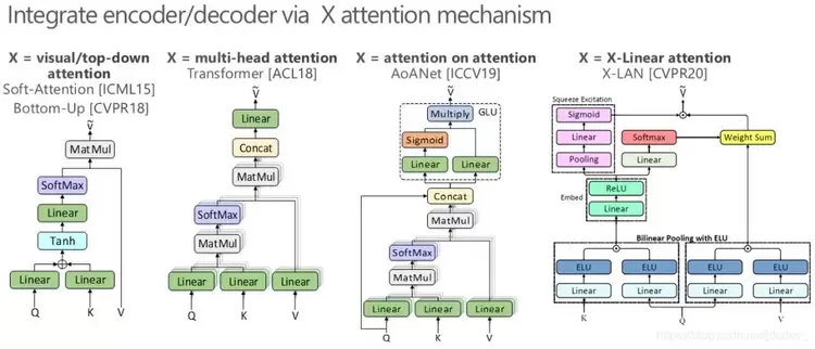 CVPR 2020 工作 X-LAN [4] 中打造了一个能实现高阶特征交互的注意力机制 X-Linear attention。它可以利用双线性融合技术去挖掘不同模态间二阶乃至更高阶的特征交互信息,以增强跨模态的内容理解。