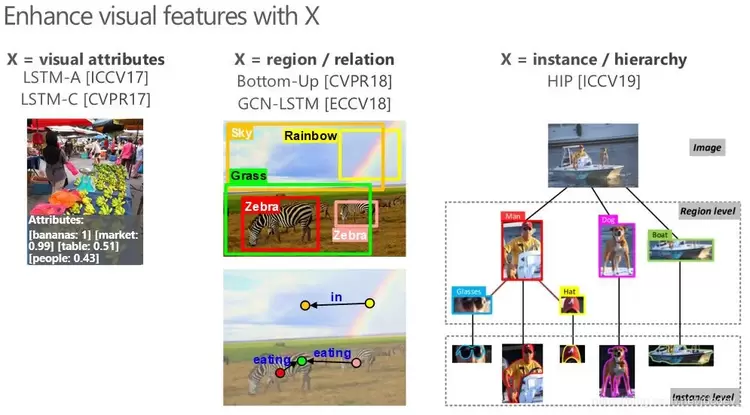 在这一阶段的视觉与语言模型本质上是视觉编码器和语言解码器的简单串联。以图像描述生成任务举例,该阶段的研究重心往往是如何从图像视觉内容中解析出更多的高层语义信息,并将这些语义信息融入到视觉编码的过程中,以增强编码器输出的视觉特征表达。这一研究思路也正是我们在前三年一系列工作的脉络,即属性(Attributes)-> 关系(Relation)-> 结构(Hierarchy)。