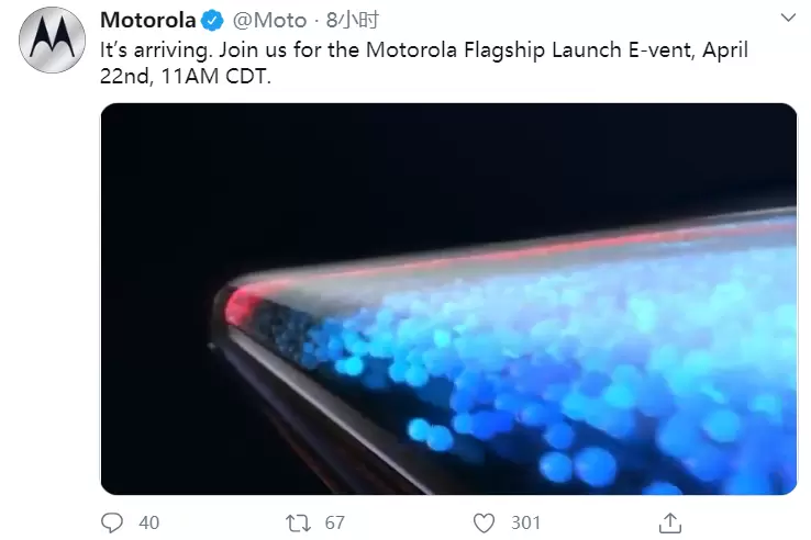 官方推文中有一段6秒钟的视频,视频前半部分展示了新机的“瀑布屏”,外媒认为Edge +和Edge两款机型均会采用“瀑布屏”,并表示两款机型齐发的可能性很大。发布会将于北美中部夏令时间4月22日11:00举办,即北京时间23日零点。外媒认为,虽然官方未明确表示,但鉴于当前的疫情形势,这次摩托罗拉的“E-vent”一定会在线上举办。