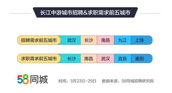 近日,58同城发布长江中游招聘求职大数据,以3月23日-29日为期,对长江中游城市群招聘求职情况进行了统计分析。报告显示,武汉企业招聘需求排名第一,长江中游城市企业平均支付月薪6172元;批发和零售业求职需求位居首位,交通运输、仓储和邮政业求职需求同比增长122.16%;普工招聘及求职需求均居首位,送餐员收入高达7890元。