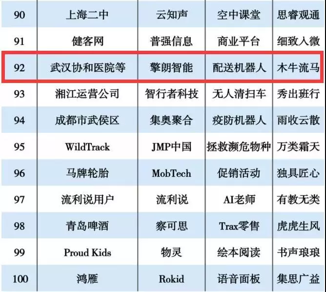 近日,由中国科学院主管、科学出版社主办的核心杂志《互联网周刊》发布“2019年度人工智能案例TOP100榜单”,擎朗智能·武汉协和医院等项目脱颖而出成功入选该榜单。