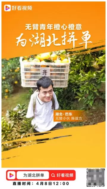 时间回拨到一个星期以前,为了解决因疫情而滞销的“中华红血橙”,这位来自湖北巴东的无臂小伙在百度好看视频上发起了电商带货直播,当天,有1000多万名好看视频网友在线围观陈兹方直播卖血橙,为他、为湖北加油打气。同时,陈兹方自家种植的数吨滞销血橙也被网友们一扫而空。其中,百度方面也积极响应为湖北拼单的号召,好看视频也参与本次直播拼单,买下数吨血橙,并联合北京联益慈善基金会将3.6吨血橙捐赠给湖北省人民医院,用以慰问拼搏在一线的医务工作者。