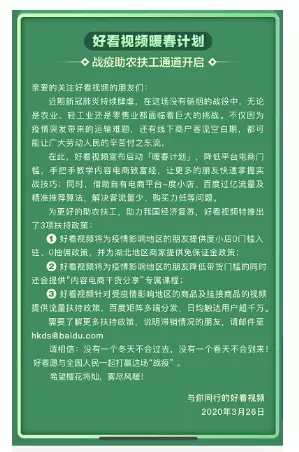 但越是严峻的考验就越需要我们发挥凝聚力。随着国内疫情防控形势的不断向好,各行各业也开始逐步复工复查,在全面“解冻”的大背景下,百度旗下短视频平台好看视频用“暖春计划”带来一场春风,通过推行多项利好政策惠农惠商,进一步吹化行业的冰层。