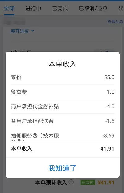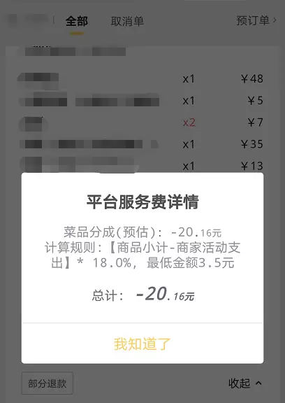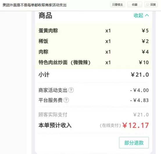 更令商户焦虑的还有佣金以及佣金以外的支出。某餐饮连锁集团创始人池程分析,根据是否为独家签约,美团抽佣比例大概在18%-26%之间,他以自己的品牌算了一笔账:佣金比例23%,平均每单抽佣5元,用户支付配送费3元,总计8元;扣除每单给骑手的4元工资,平台收入囊中的依然占50%。