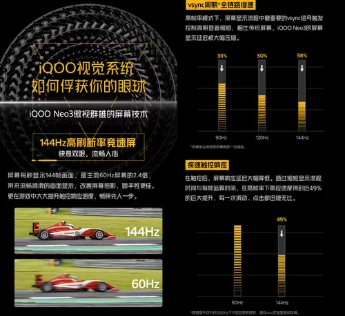 4月16日,iQOO手机官方发布屏幕技术系统介绍,走起了“炫技”路线。iQOO Neo3不仅带来了行业内最高的144Hz竞速屏,还将支持全局自适应刷新率,采用LTM阳光屏技术,可谓对屏幕体验进行了大幅优化和升级,势必让用户体验一把“用了就回不去”的硬核感受。